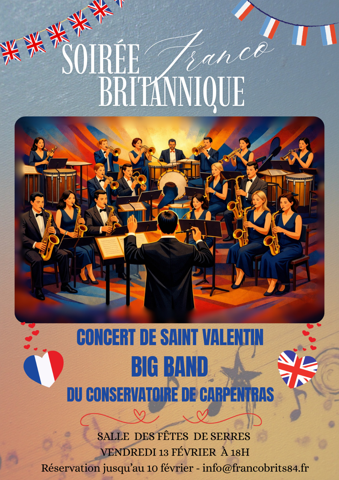 Venez fêter la Saint Valentin à la Salle de Fêtes de Serres avec le Big Band du conservatoire de Carpentras, le vendredi 13 février à 18 heures.Si vous souhaitez participer veuillez envoyer un mail à info au francobrits84.fr jusqu'au 10 février au plus tard. PAF: Adhérents 5€ Non-adhérents 8€ à payer par virement : IBAN CIC: FR76 1009 6181 0700 0243 2740 174.